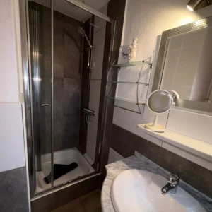 Bad: Helles Badezimmer mit moderner Duschkabine.